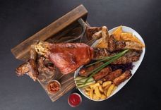 2500 г • Большой гриль: аппетитная свиная рулька, ассорти ребрышек, домашние колбаски и тортилья с сыром. Подается с картофельными дольками, маринованными огурцами, капустой и домашней аджикой. Каждый найдет себе кусочек по вкусу