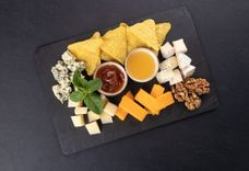 160/50 г • Ассорти деликатесных и фермерских сыров, подается с медом, соусом чатни и орехами.