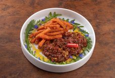 180/100 г • Пикантный вкус рубленой говядине добавляет халапеньо, копченая паприка и соус манго. В состав также входят лук, маринованный огурец, горчица, желток. Подается с бататом фри и соусом шрирача для дополнительной остроты.