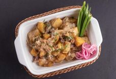 320 г • Кусочки говядины томленые с картофелем и грибами в сливочном соусе.