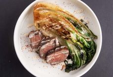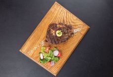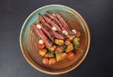160/150 г • Этот сочный стейк из покромочной части, маринованный в специях, подается картофелем и соусом из печеного чеснока. Его секрет — в очень тонкой нарезке. Рекомендуемая степень прожарки: medium rare.