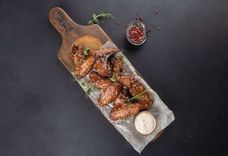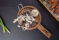400/50 г • Вкусные и нежные куриные крылышки в глазури из меда, горчицы и кайенского перца, посыпаются кунжутом и подаются с чесночным соусом.