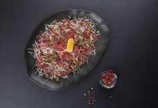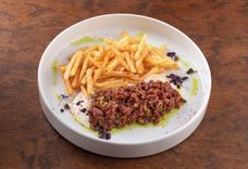 200/140/120 г • Свежая говяжья вырезка рубленая на мелкие кубики, маринованная в смеси оливкового масла, черного молотого перца и коньяка. Подается с тостами из хлеба, корнишонами, каперсами, луком и горчицей.