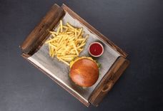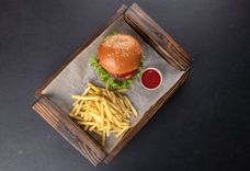 345/150/50 г • Сочная говяжья котлета на крафтовой булочке, с двумя фирменными соусами , огурчиком и хрустящими чипсами из бекона. Подается с картофелем фри и кетчупом.
