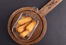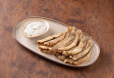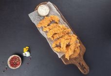 260/50 г • Кусочки нежного куриного филе в хрустящей панировке, обжаренные до золотистой корочки, подаются с соусом тартар.