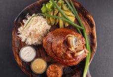 За 100 г • Запеченная свиная рулька, маринованная в пиве. Подается с гарниром из тушеной капусты, соленого огурца, с хреном, горчицей и аджикой