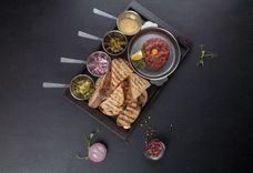 180/50 г • Нежный хумус из нута с тахини и лимоном, подается с овощной сальсой и хрустящими чипсами из тортильи. Лёгкая и яркая закуска.