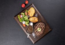 180/150 г • Нежный и сочный стейк из говяжьей вырезки, подается с сезонным гарниром (уточняйте у официанта)