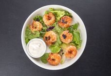 150/50 г • Креветки, обжаренные в чесночном маринаде с белым вином, подаются с чесночным соусом.