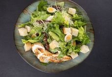 215 г • Салат из хрустящих листьев ромена, свежей зелени, классического соуса, подается с чесночными гренками и вяленными томатами