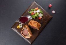 500/50 г • Наше фирменное блюдо — нежнейшая говяжья вырезка, запечённая в слоеном тесте с прослойкой из бекона и цуккини.