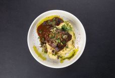 200/150/30 г • Нежные говяжьи щечки, томленые в соусе в соусе демиглас, подаются с картофельным пюре.